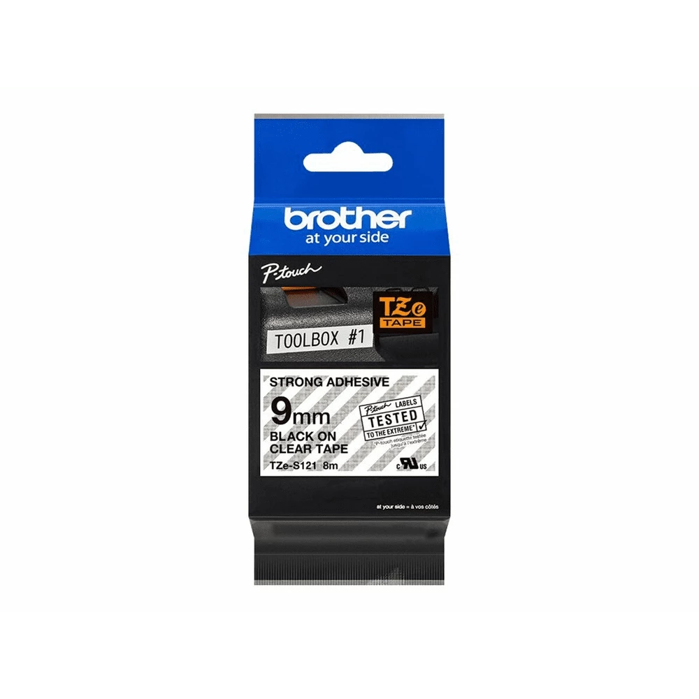 Brother TZe-S121 – Extra starker Klebstoff – schwarz auf durchsichtig – Rolle (0,9 cm x 8 m)